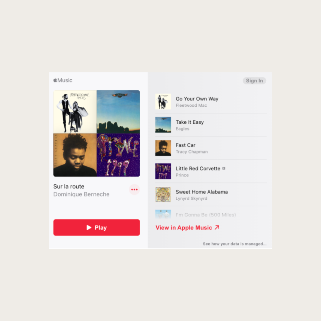 Rendez votre trajet inoubliable grâce à la musique, avec entre autres les suggestions musicales de Dominique pour vous accompagner sur la route. Montez le volume et préparez-vous à chanter à tue-tête! On s’excuse d'ailleurs à vos enfants s’ils ont honte…